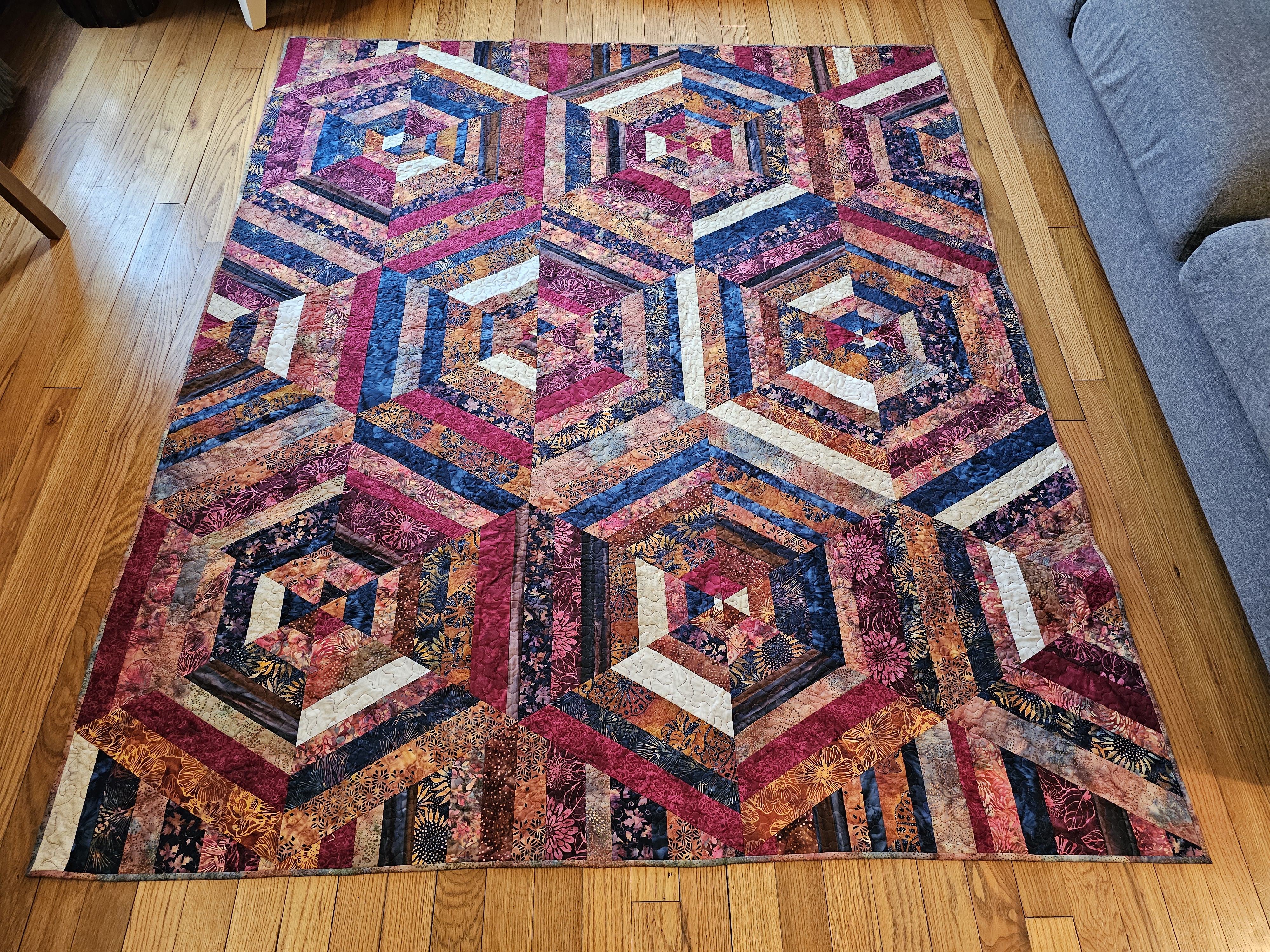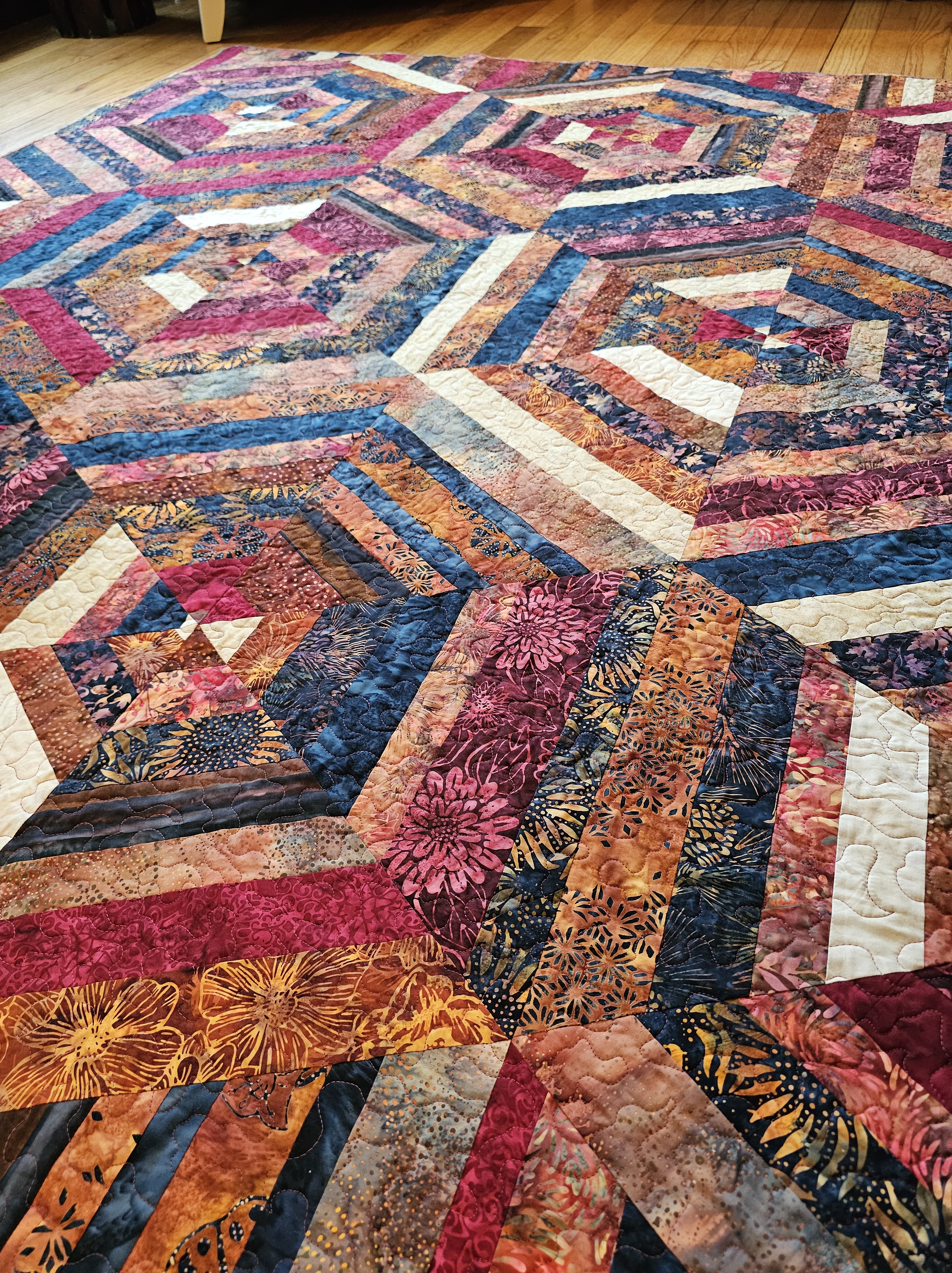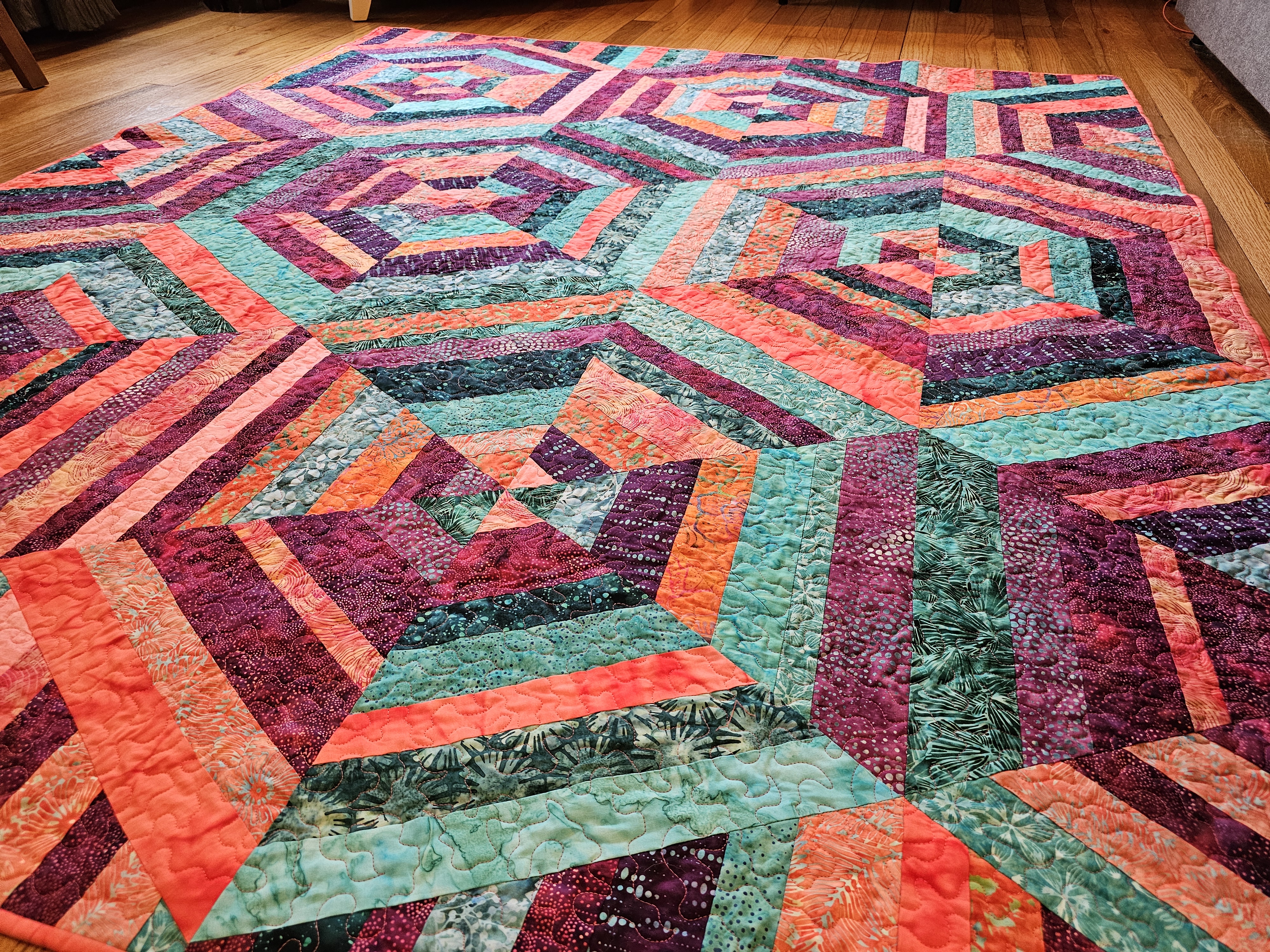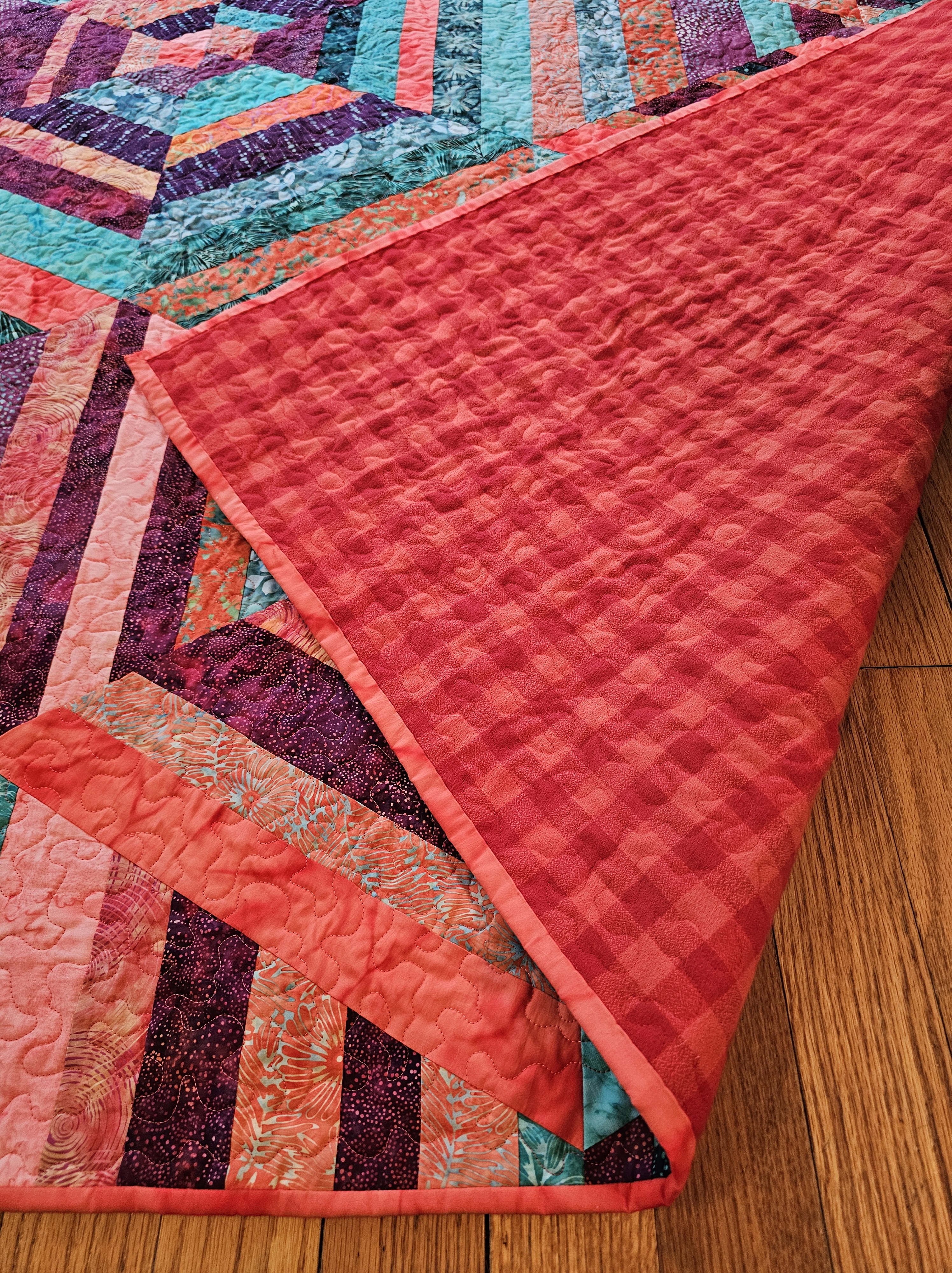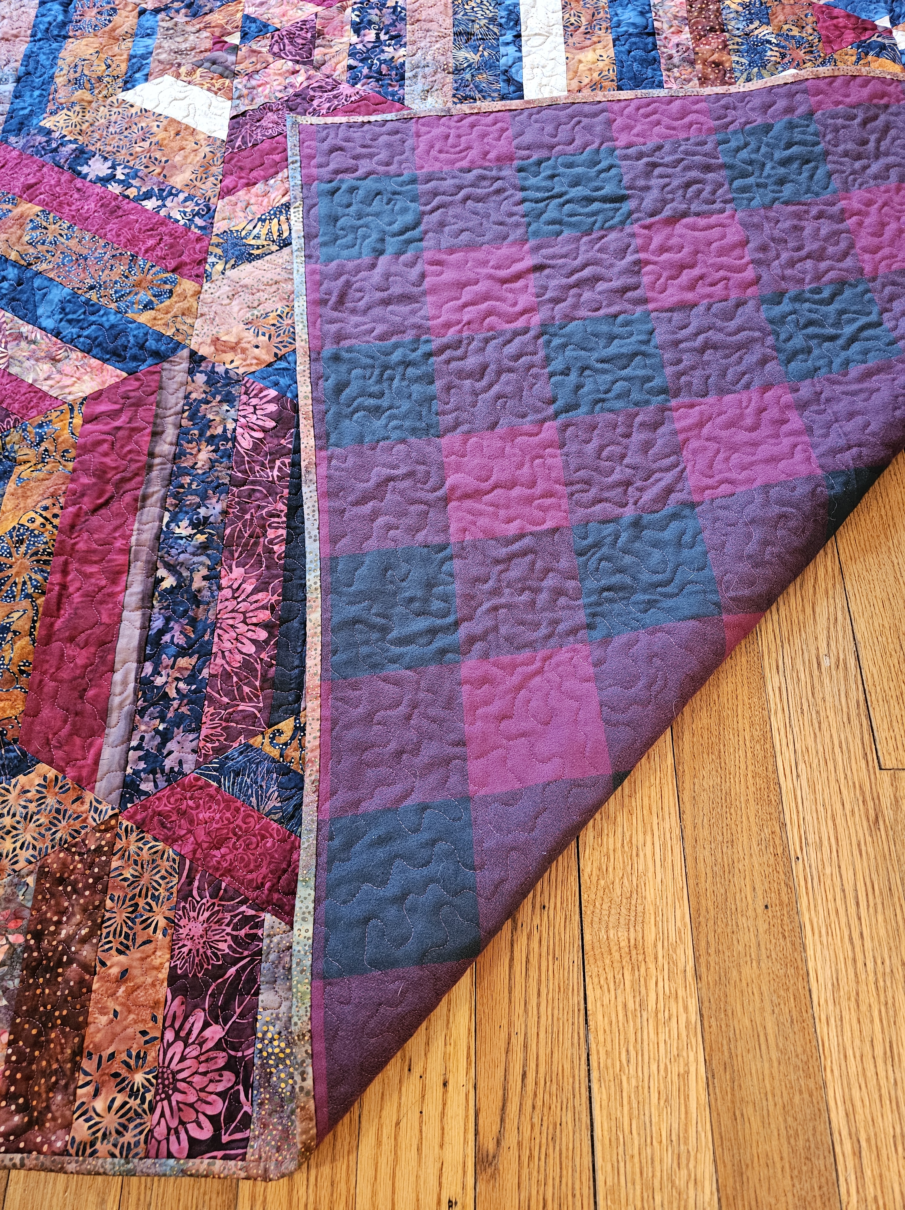 The bright quilt is made from aqua, magenta, and pinkish-orange batiks. It is backed with orange-red flannel. The earthy quilt is made from brown, burgundy, and navy batiks. It is backed with a plum-purple buffalo plaid flannel. Both quilts measure approximately 70″ x 80″.